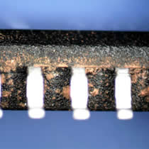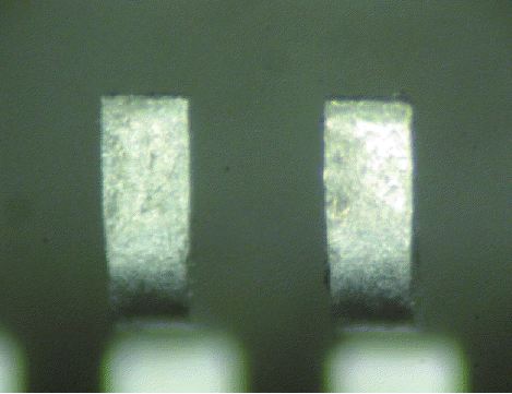 酸化は自然に発生するため、これは偽造検出方法ではありません。ただし、これは機能にとって重要な問題であり、特に東南アジアや北米南部の州などの高温多湿の気候でよく見られます。共同規格J-STD-002は、スルーホール、表面実装、およびBGAデバイスのテスト方法と承認/拒否基準を定義しています。非BGA表面実装デバイスの場合、ディップアンドルックが採用され、BGAデバイスの「セラミックプレートテスト」が最近当社のサービススイートに組み込まれました。不適切なパッケージ、許容できるパッケージで提供されているが1年以上経過しているデバイス、またはピンに汚れが見られるデバイスは、はんだ付け性テストに推奨されます。